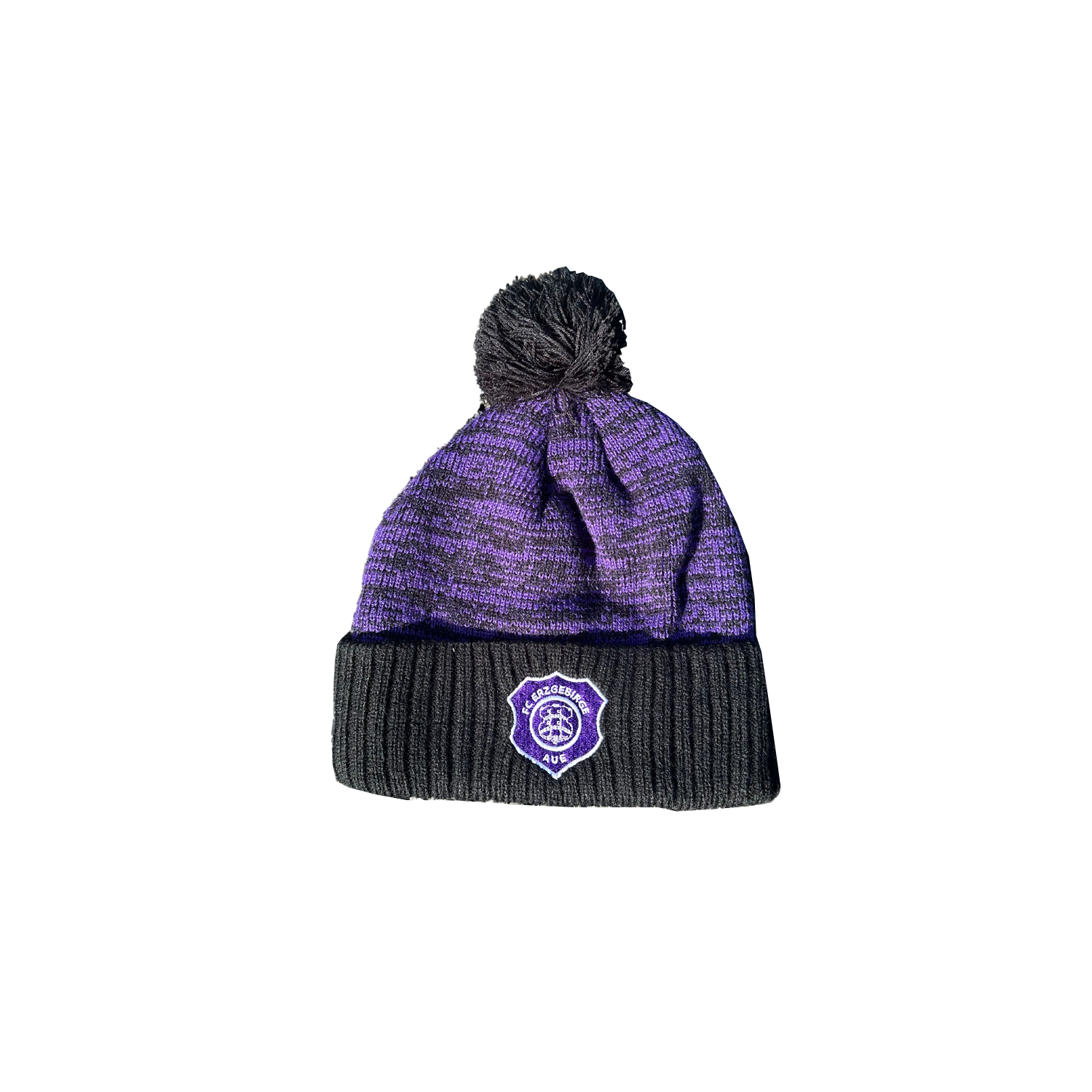 Hochwertige grob gestrickte Mütze mit Bommel und Logo FC Erzgebirge Aue.